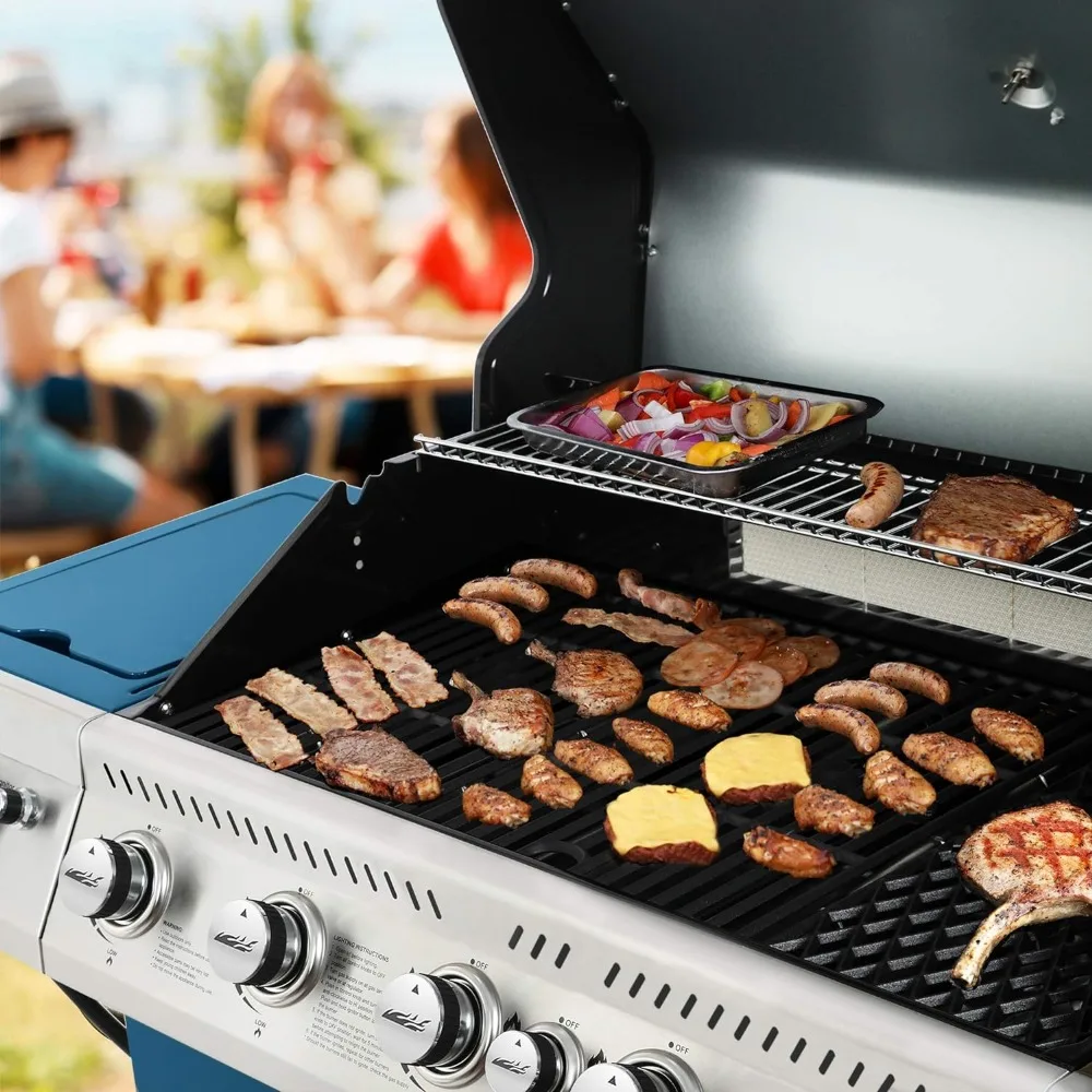 - Spacious Cooking Space: 738 sq. in. cooking space in total, including 566 sq. in. porcelain-enameled cast iron cooking grates and 172 sq. in. porcelain-enameled steel wire warming rack that accommodate about 18 hamburgers simultaneously.