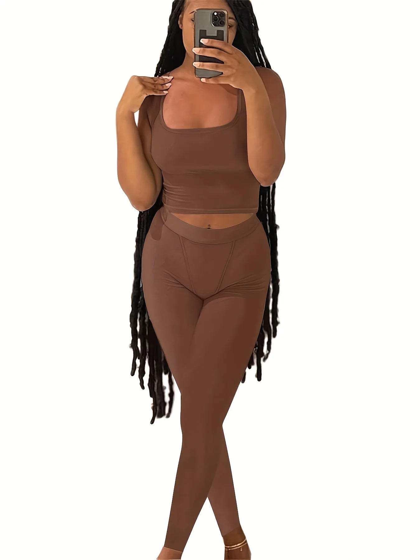 Women's 2-Piece Workout Set - Ribbed Knit Crop Top & High-Waisted Leggings -